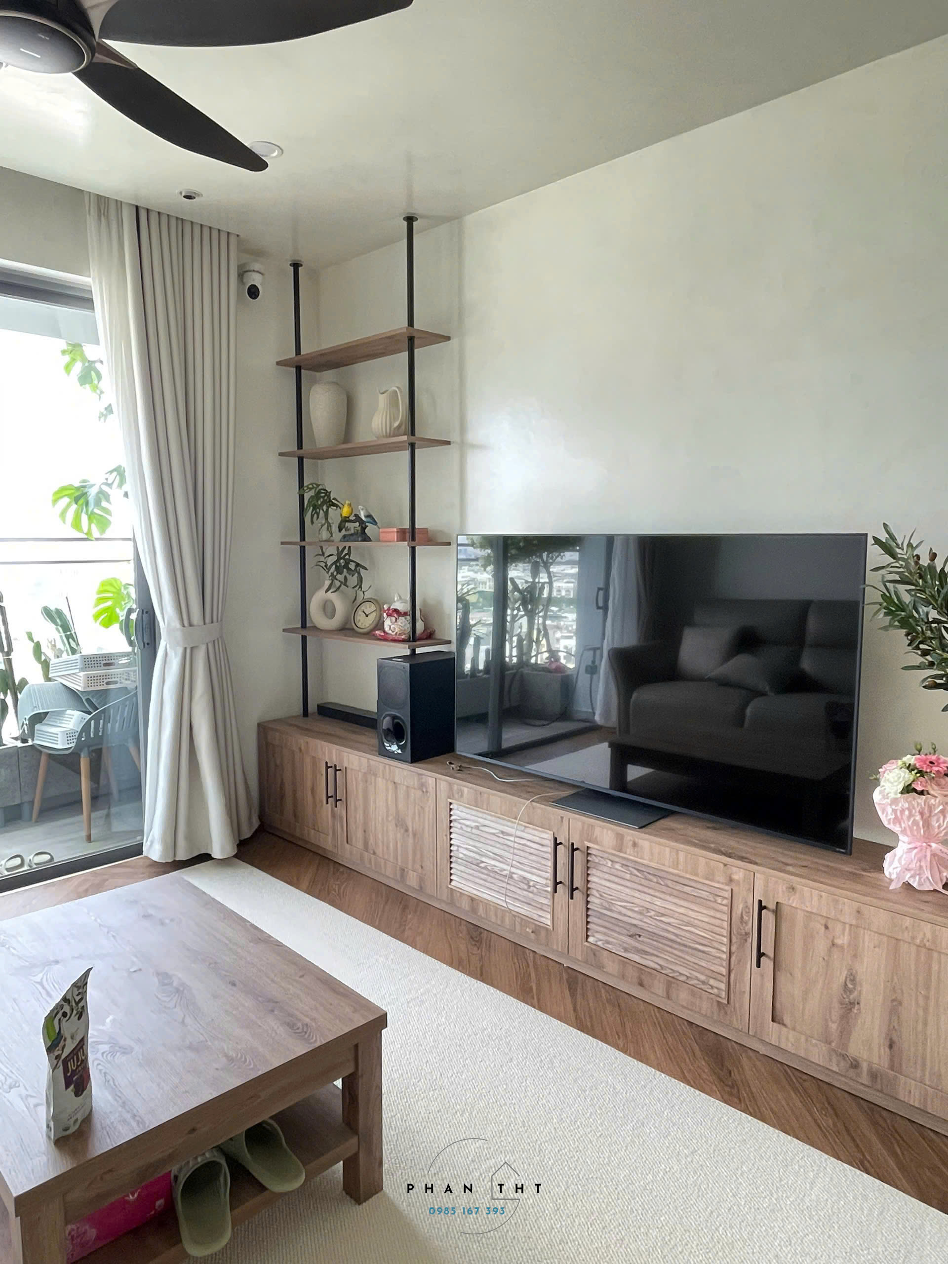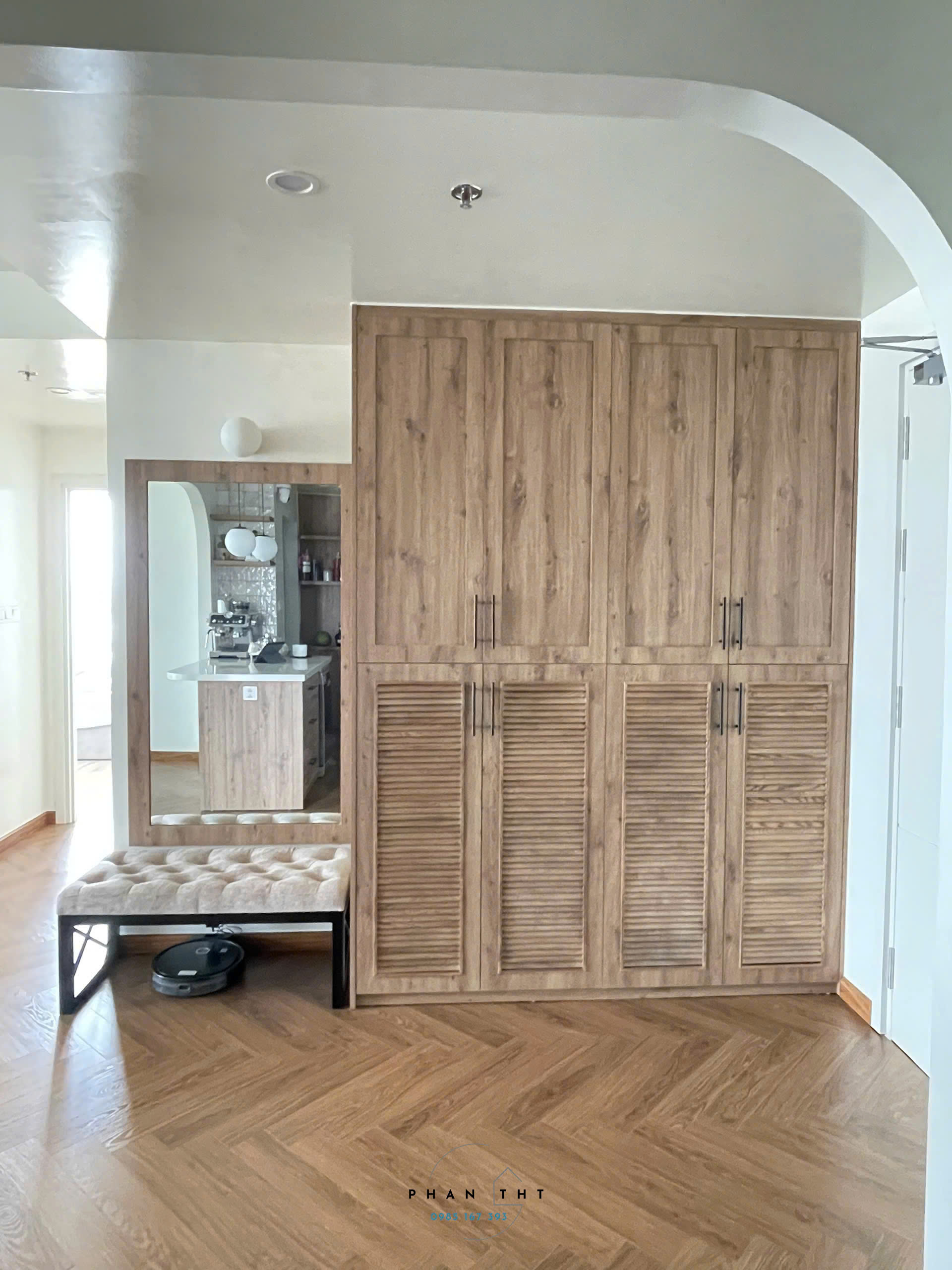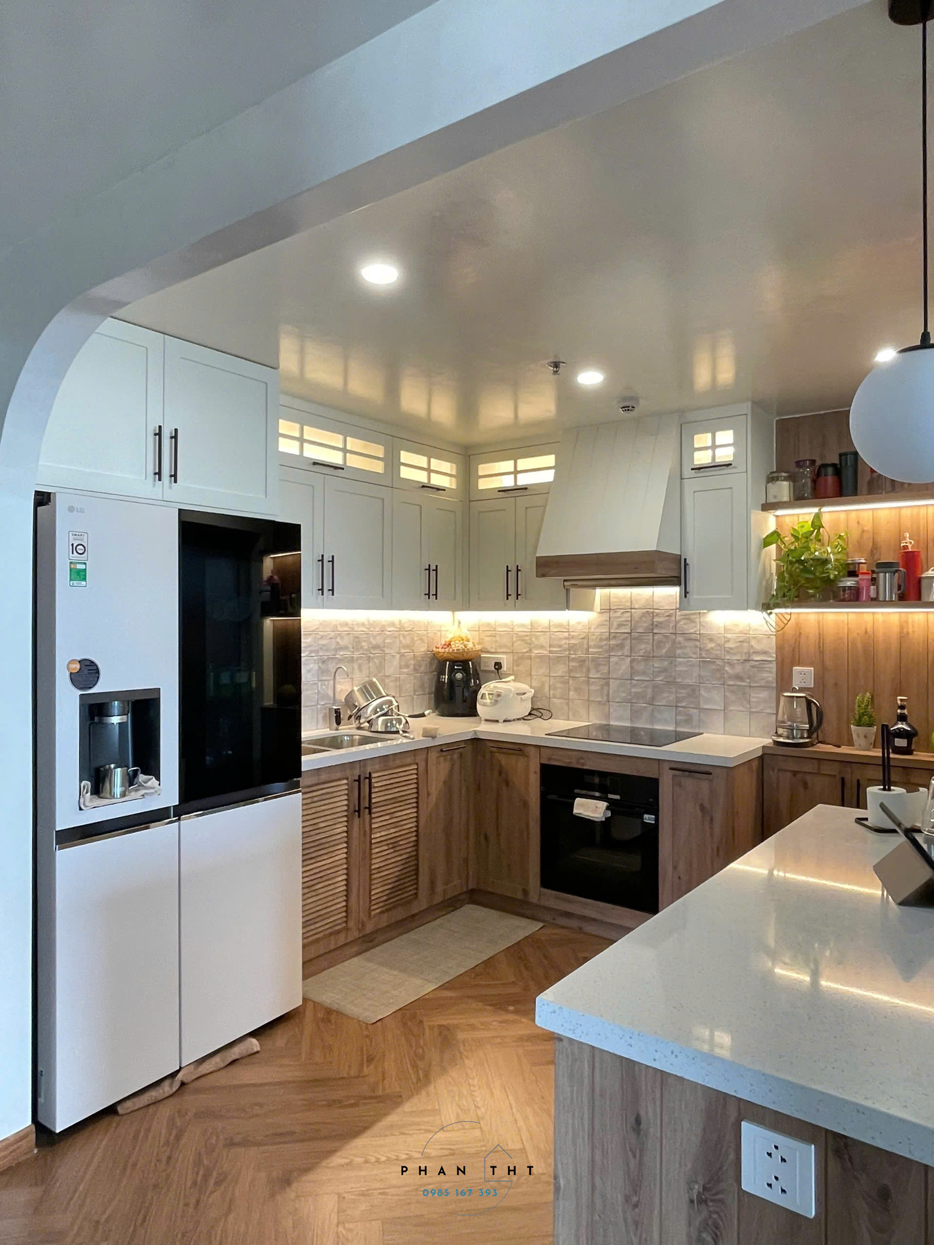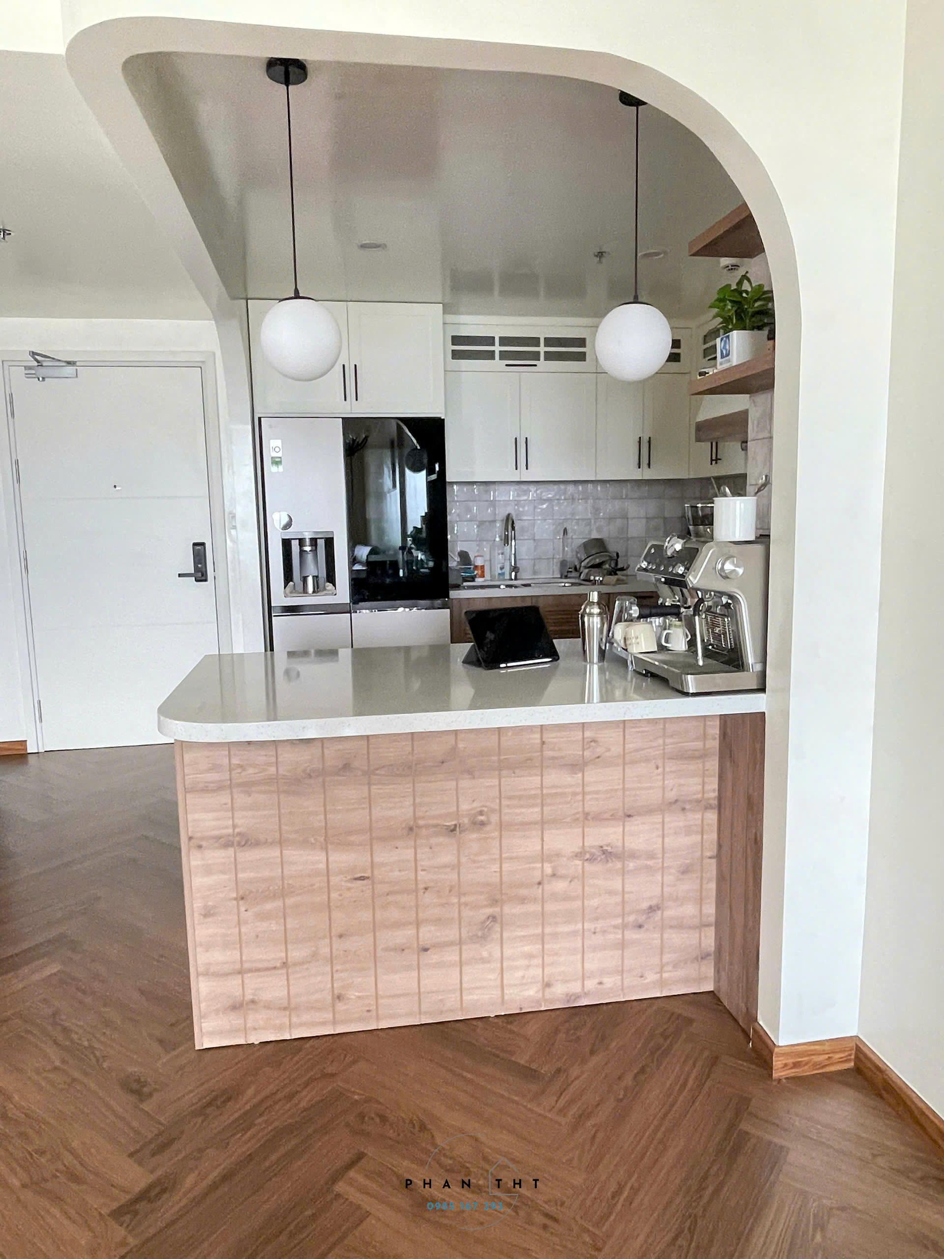 Phan THT mang đến một thiết kế nội thất Farmhouse mộc mạc đầy ấm áp cho căn hộ 3 phòng ngủ. Không gian được lót bởi sàn gỗ thoáng mát, kết hợp cùng gam màu trung tính vân gỗ tự nhiên, tạo nên cảm giác gần gũi, thư thái nhưng vẫn tinh tế.