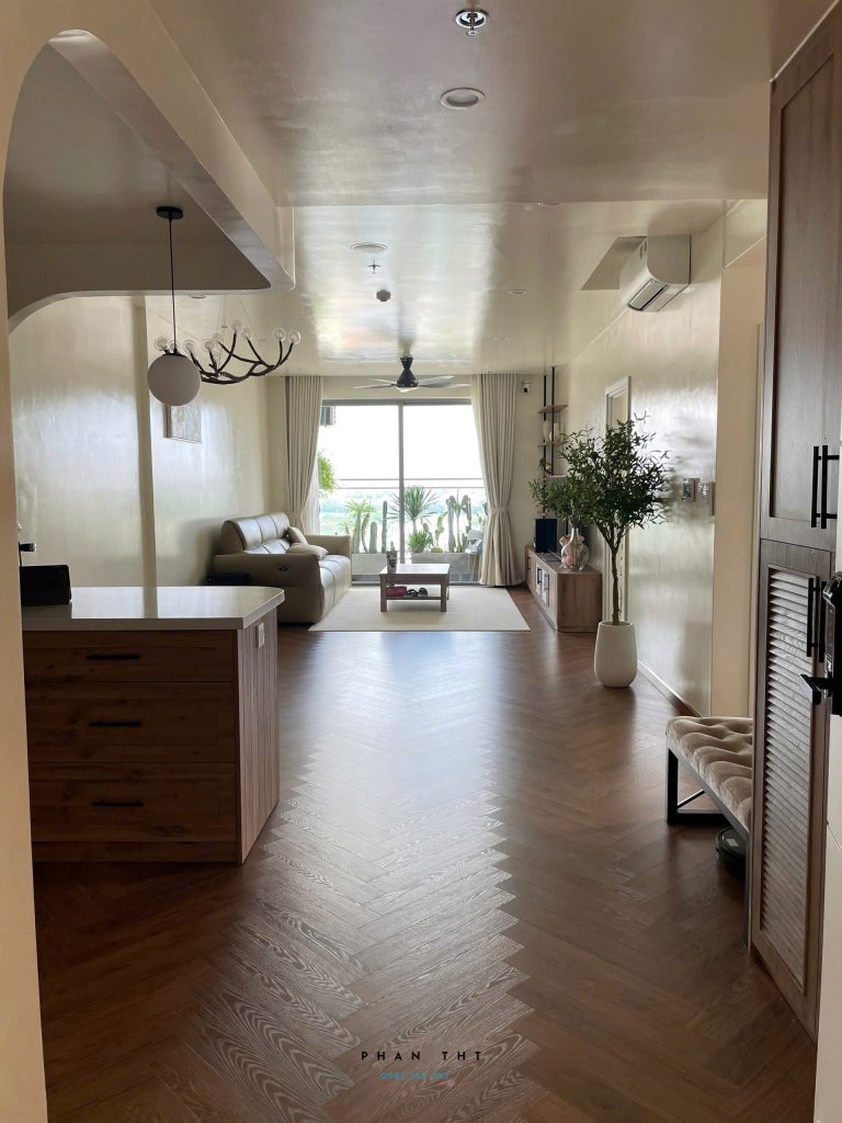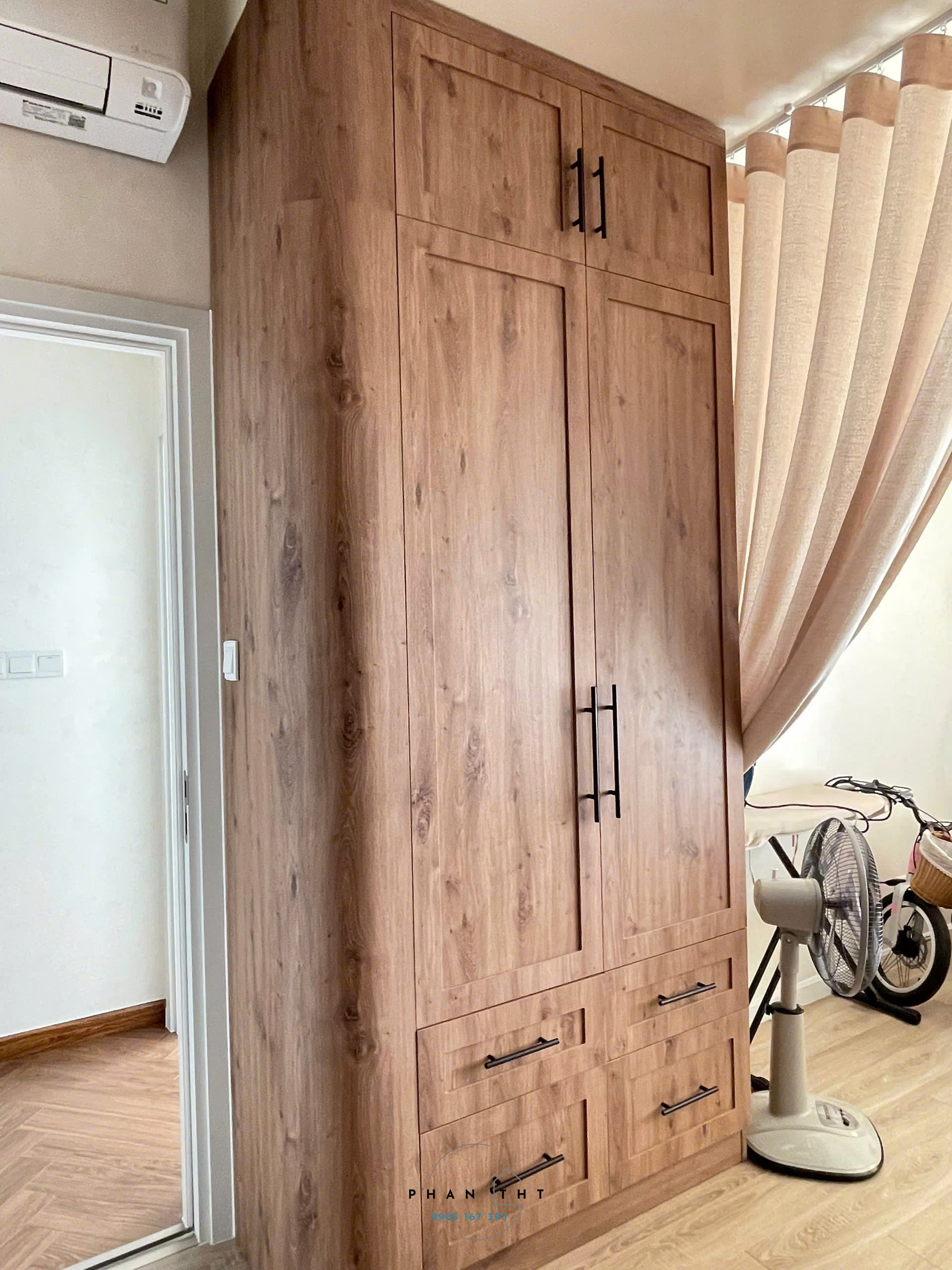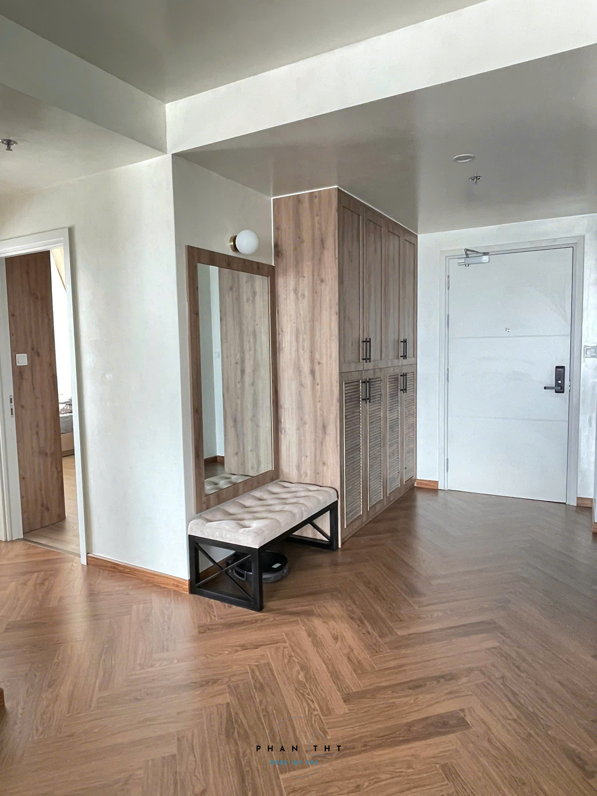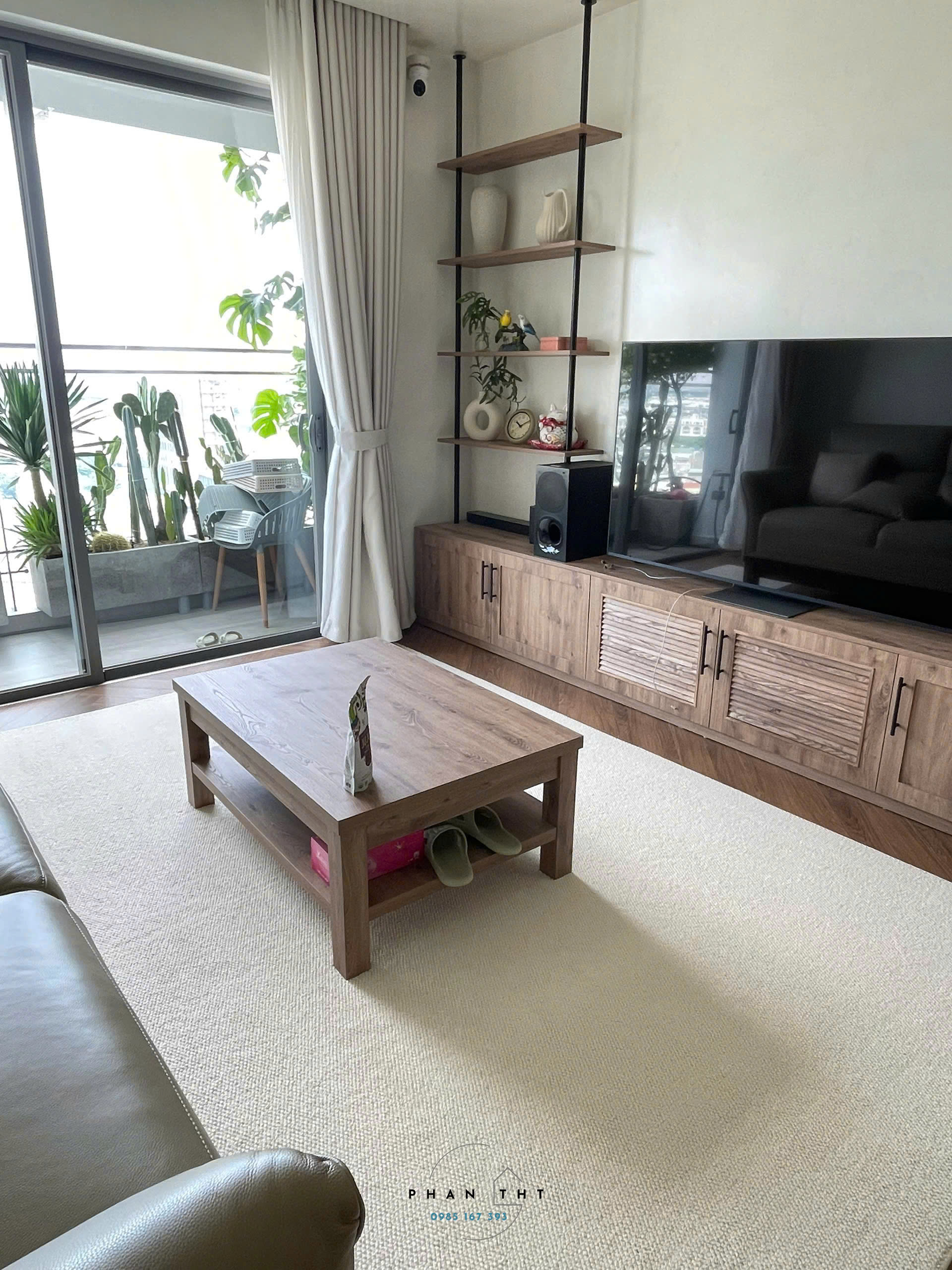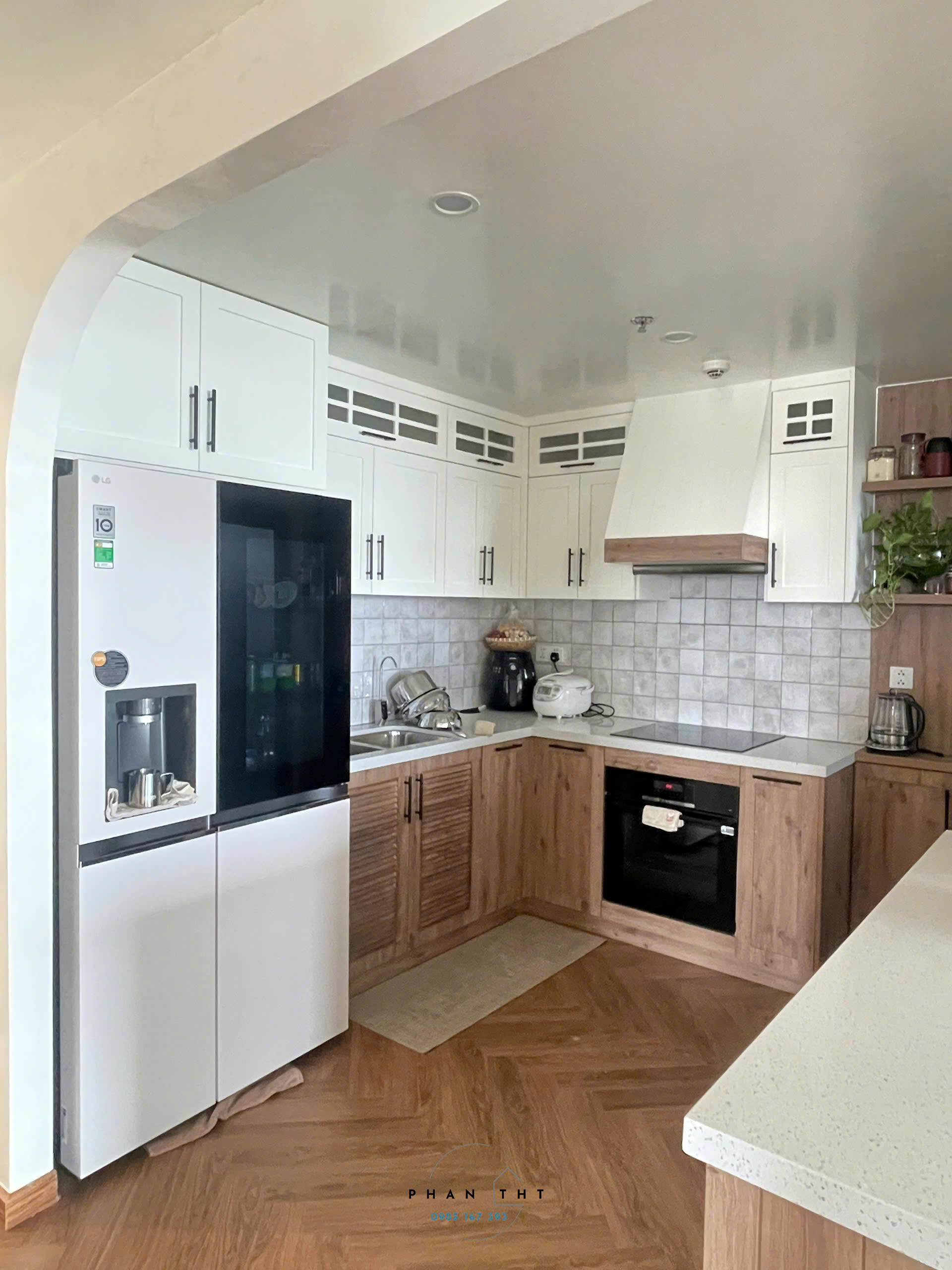 Phan THT mang đến một thiết kế nội thất Farmhouse mộc mạc đầy ấm áp cho căn hộ 3 phòng ngủ. Không gian được lót bởi sàn gỗ thoáng mát, kết hợp cùng gam màu trung tính vân gỗ tự nhiên, tạo nên cảm giác gần gũi, thư thái nhưng vẫn tinh tế.