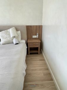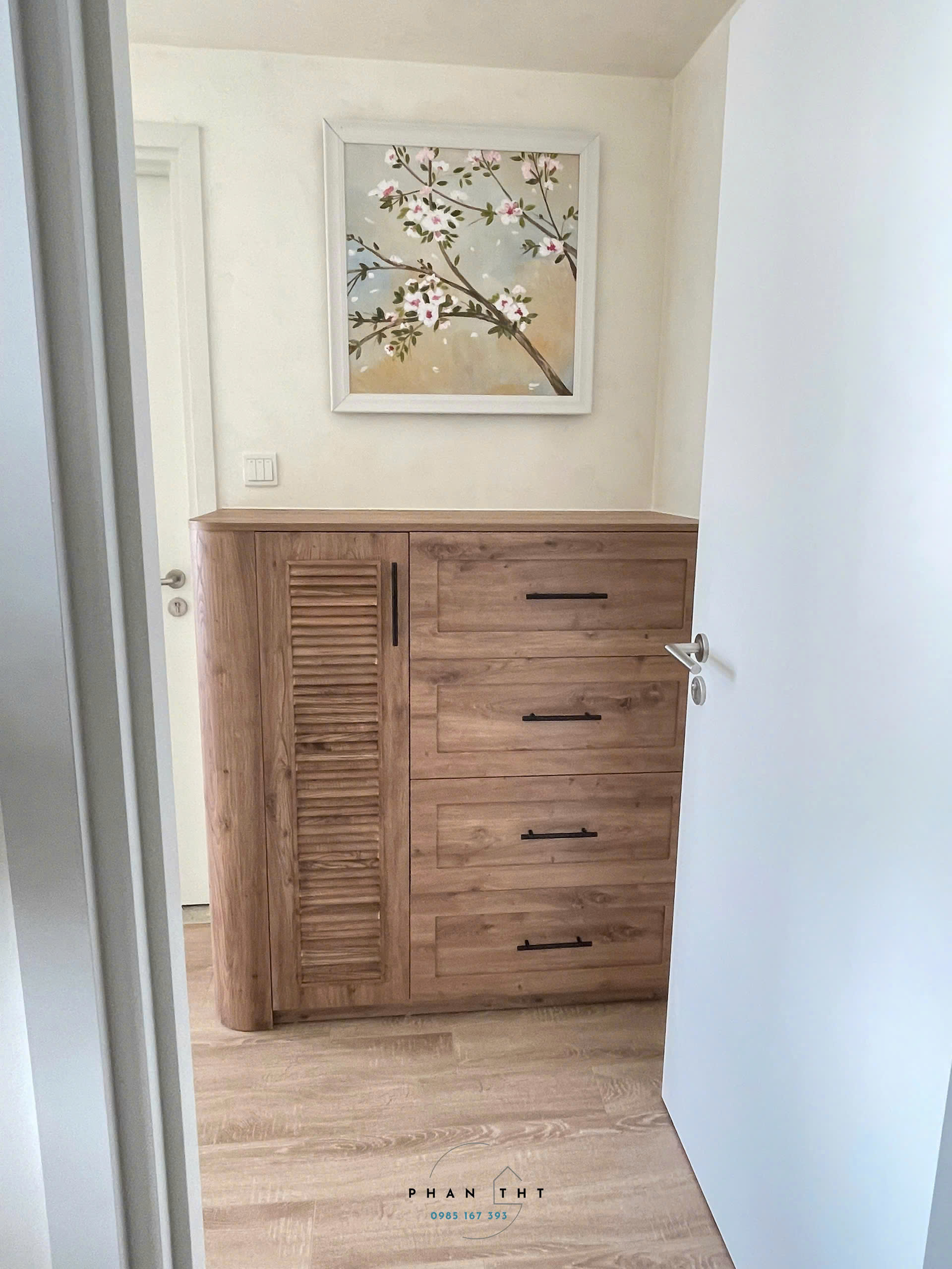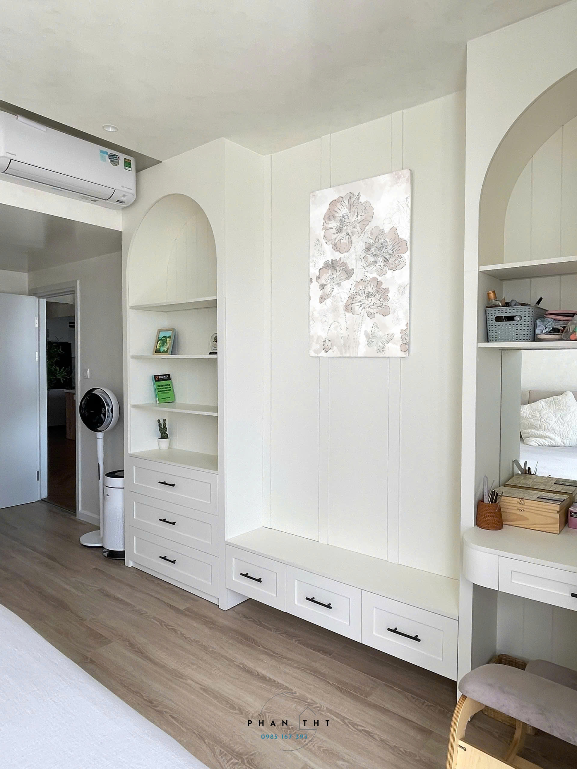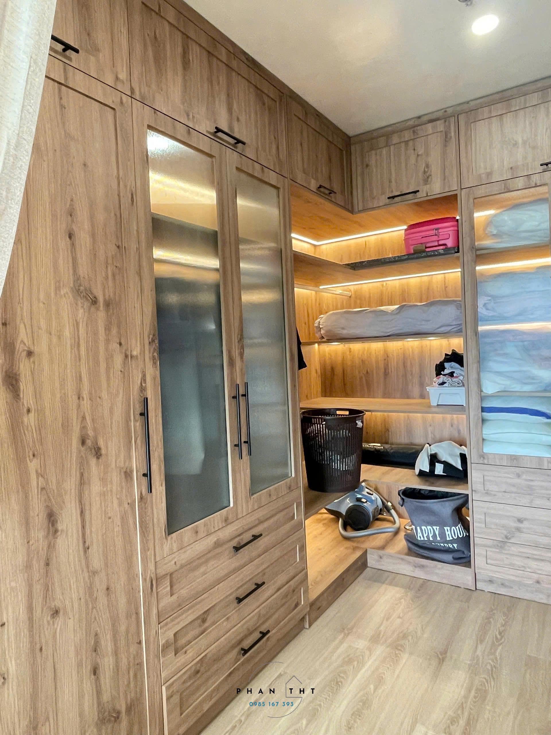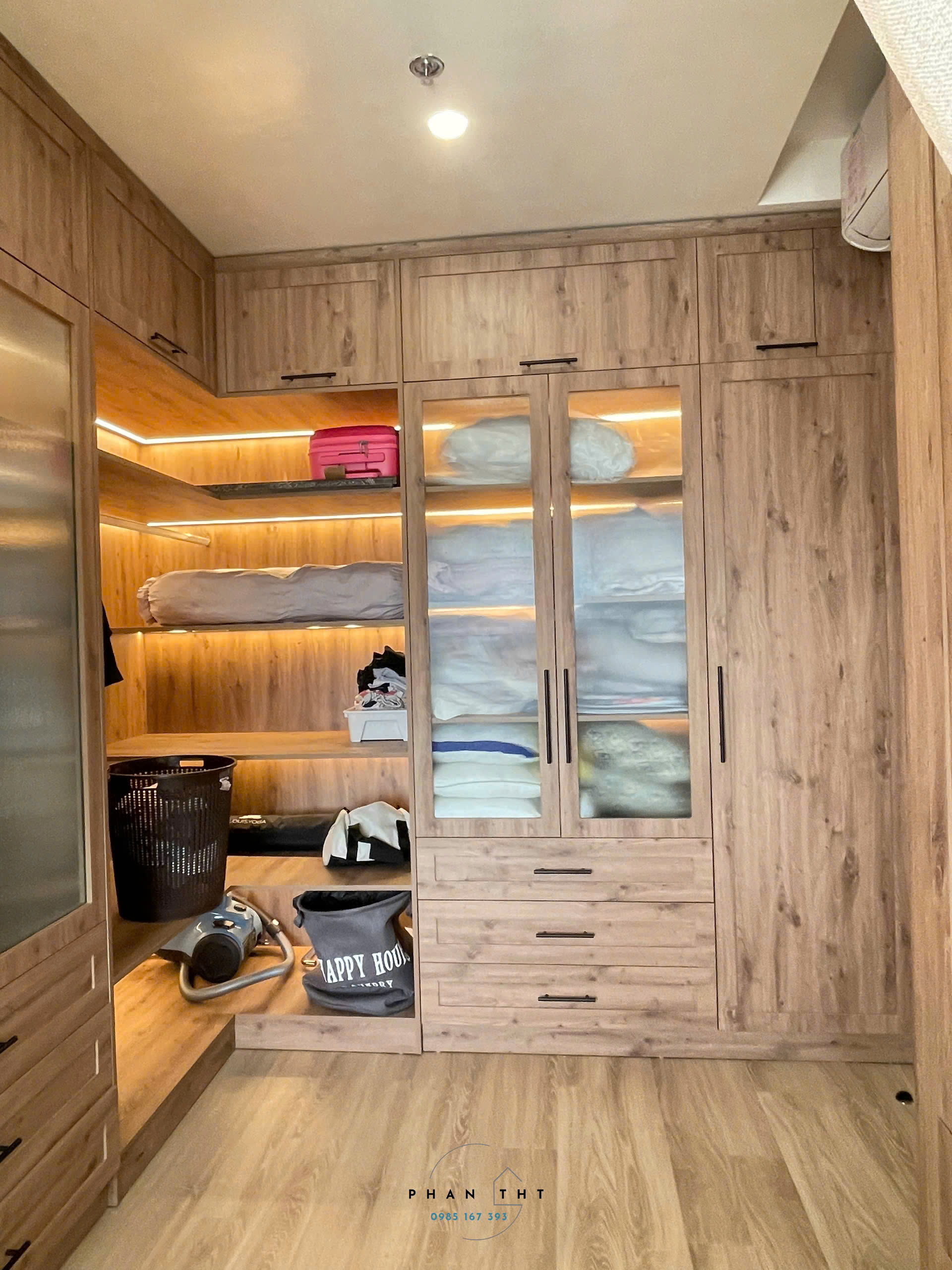 Phan THT mang đến một thiết kế nội thất Farmhouse mộc mạc đầy ấm áp cho căn hộ 3 phòng ngủ. Không gian được lót bởi sàn gỗ thoáng mát, kết hợp cùng gam màu trung tính vân gỗ tự nhiên, tạo nên cảm giác gần gũi, thư thái nhưng vẫn tinh tế.